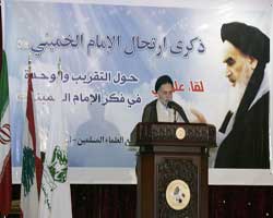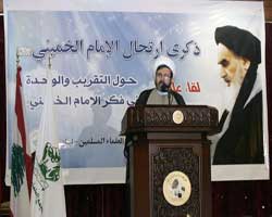 في أجواء الذكرى السنوية لوفاة الإمام الخميني (قدّس سرّه) أقام تجمع العلماء المسلمين في لبنان ندوة فكرية تحت عنوان: "التقريب والوحدة في فكر الامام الخميني (قدّس سرّه)"، تحدّث فيها نائب الأمين العام لحزب الله سماحة الشيخ نعيم قاسم، وذلك في مطعم الساحة طريق المطار.