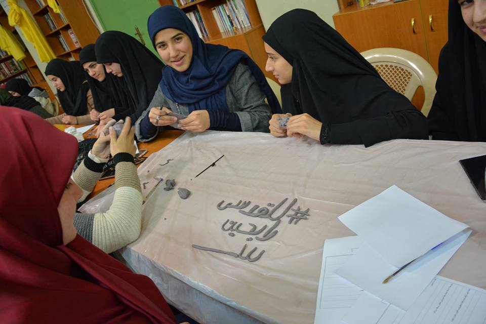 بمناسبة الدفاع عن القدس ورفض الاعتداء عليها اقام مركز الامام الخميني (قده) الثقافي في النبطية بالاشتراك مع التعبئة التربوية فرع الثانويات بأعمال فنية بعنوان { القدس هبة الله الينا } وقامت الاخوات بالاعمال الفنية عن القدس وواقعها.